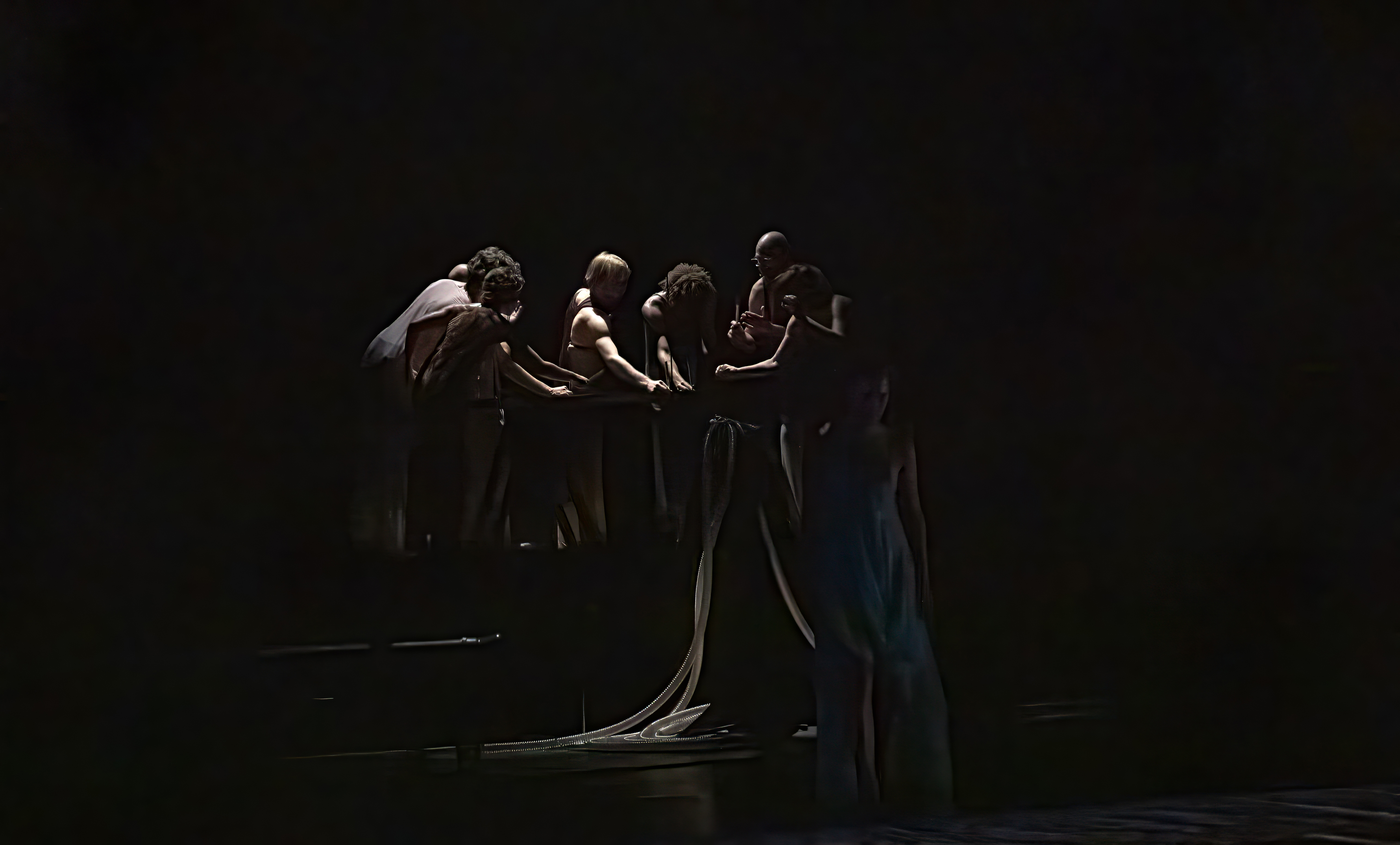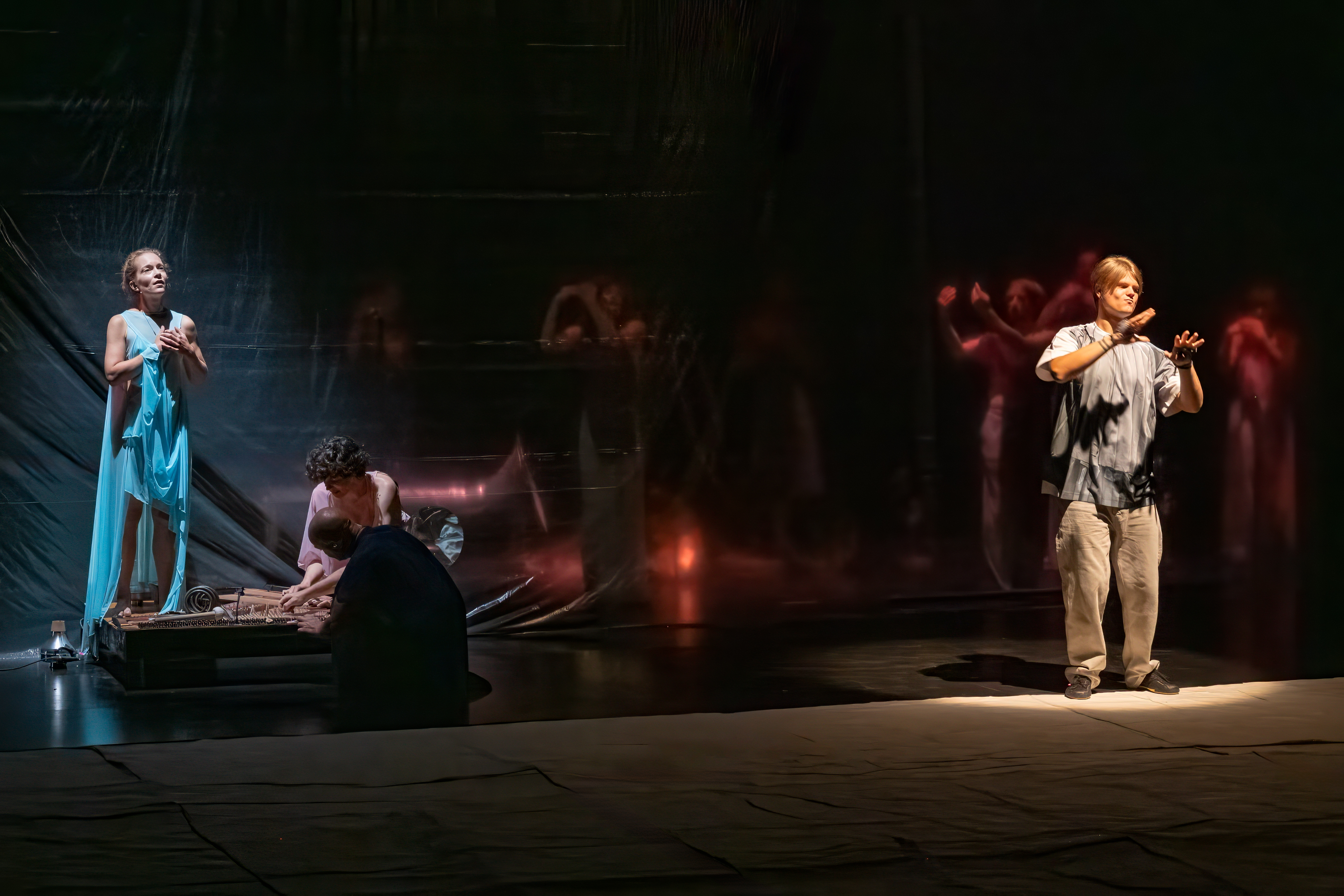Around him, dancers and vocalists form a responsive collective. Messages are translated, distorted and retranslated as they circulate through the ensemble. Sound transforms into sign, sign returns as movement or resonance. Meaning remains fluid.